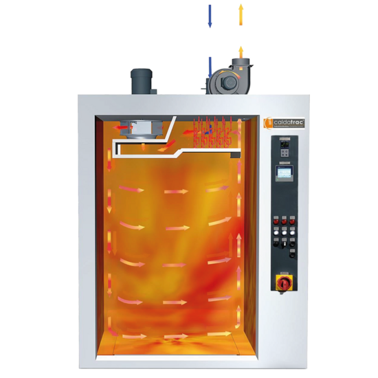 Der Umluftvolumenstrom wird durch den Umluftventilator aus dem Ofenraum rechts abgesaugt, über das Heizregister erwärmt und im Ventilatorrad im Temperaturgefüge homogenisiert.